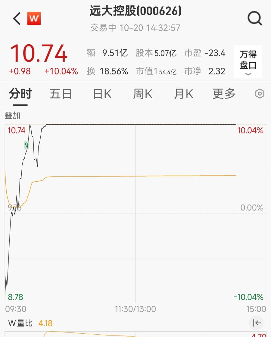 10月20日,高位人气股远大控股(000626.SZ)上演“天地天”行情,走出5连板。截至发稿,该股报10.74元/股,成交额超9.5亿元。