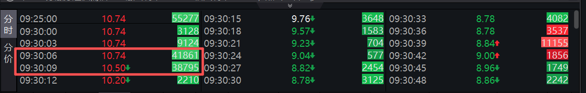 值得注意的是,开盘后仅20多分钟,该股就经历了从涨停到跌停,又迅速拉回涨停的“过山车”行情。具体来看,该股以10.74元涨停价开盘,但9点30分刚过,市场出现两笔大额卖单,分别为38795手与41861手,合计金额超8000万元,在随后的30秒内,股价便被砸至8.78元的跌停价,上演“天地板”行情。不过,跌停板并未持续太久,大额买盘随即集中涌入,推动股价快速反弹,仅用20多分钟便重新收复涨停板,完成“地天板”反转。
