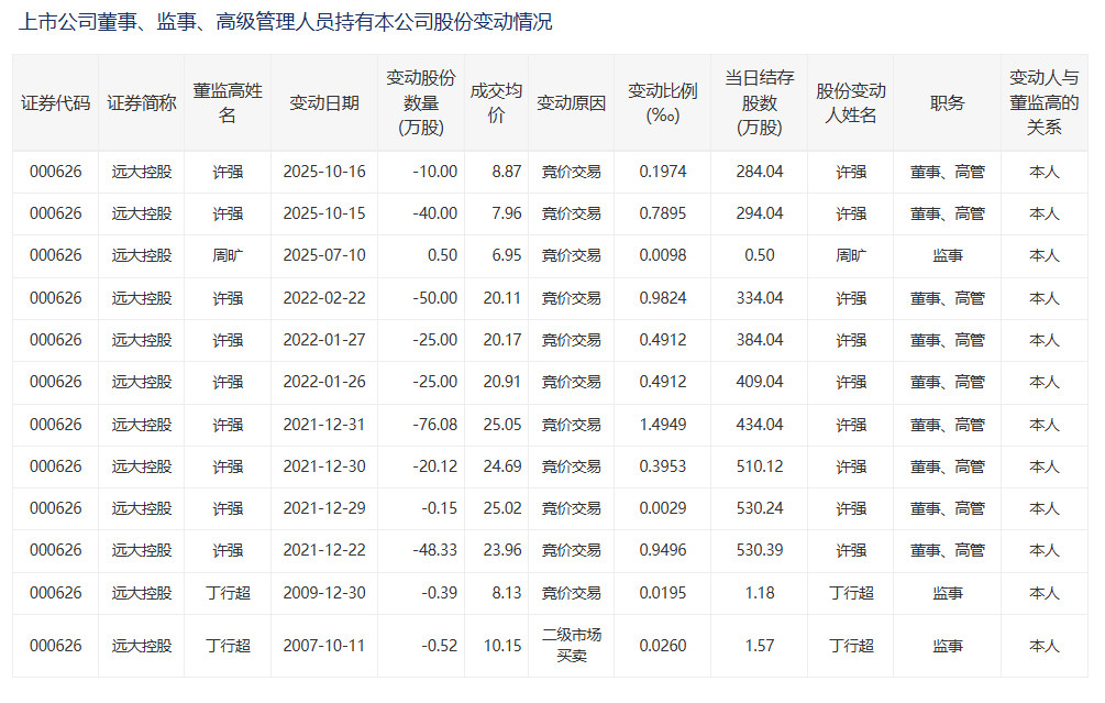 值得注意的是,远大控股股价连涨下,公司高管却在减持套现。据深交所官网,10月15日、16日,远大控股副董事长、副总裁许强通过竞价交易,先后减持公司40万股、10万股,成交均价分别为7.96元/股、8.87元/股,合计减持套现407.10万元。